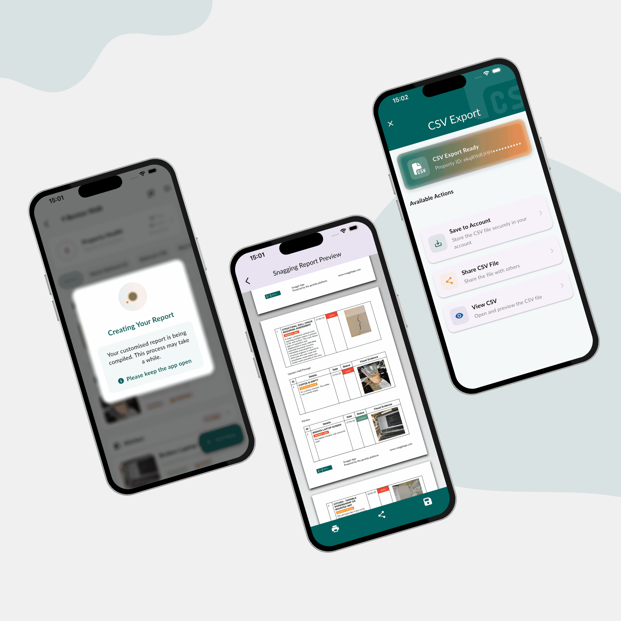 Snagging reports that cannot be ignored. PDF reports that are easy to read and understand, with photos and notes. CSV data export for external analysis.